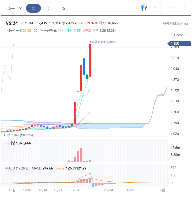 - 성문전자, 오늘 상한가 2,435원 (+29.87%) 기록하며 52주 신고가 경신