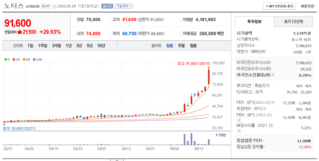 노터스는 비임산 임상시험수탁(CRO) 업체이다. 이회사는 최근 HLB에게 인수 되면서 지난 11일부터 6일동안 연속 상승을 이루고 있었다. 지난 9일 기존 1주당 신주8주를 배정하는 역대 최대 규모의 무상증사를 진행한다고 공시 하면서 상한가로 마무리 되었다. 지본금의 38배가 넘는 303억원 규모의 자본잉여금을 보유하고 있어서 대규모의 무상증자가 가능하다고 전망하고 있다.