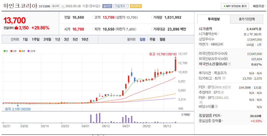 하인크코리아는 2020년 설립된 모바일 서비스 플랫폼 운영사 이다. 구글, 카카오,디즈니, 제주항공,커피빈, 오리온, 빙그레등등 20여개의 브랜드 컬래보레이션을 진행도 했엇다. 이번 상한가요인은 잉글랜드 프로축구 토트넘 홋스퍼FC 의 지식재산권 사용 라이선스를 계약을 완료했다는 소식에 상한가로 마무리 한것으로 보인다.
