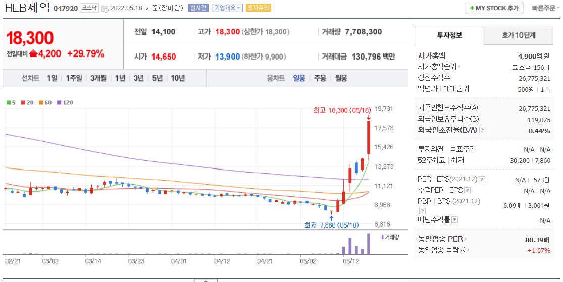 현재 개발중인 함암치료제 '리보세라닙'의 글로벌 상용화 에대한 기대감으로 상한가로 마쳤다.
