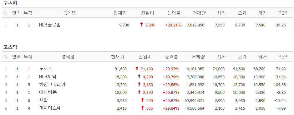 18일 오늘 코스피 1종목 코스닥6개 종목이 상한가로 마무리되었다.