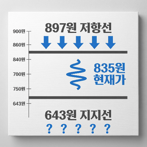 현재 835원은 기술적으로 여러 저항선들 사이에 위치해 있어요. 이건 상당히 불안정한 포지션이에요. 왜냐하면 어느 방향으로든 움직일 준비가 되어 있다는 뜻이기 때문이죠. 하지만 MACD와 이동평균선 상태를 고려하면 아래로 움직일 확률이 훨씬 높아요.
