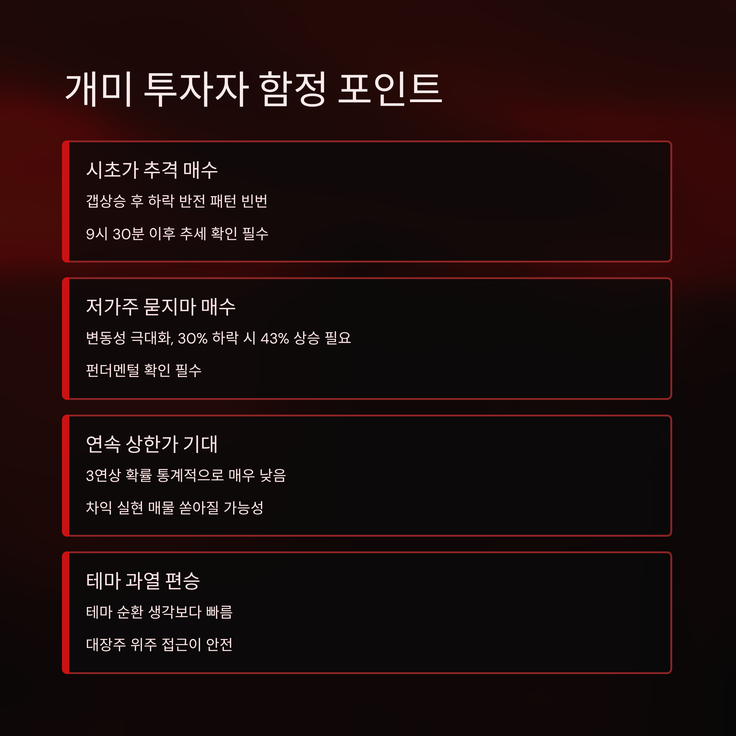 | 테마 과열 편승 | 테마 순환 빠름 | 대장주 위주 접근 |
