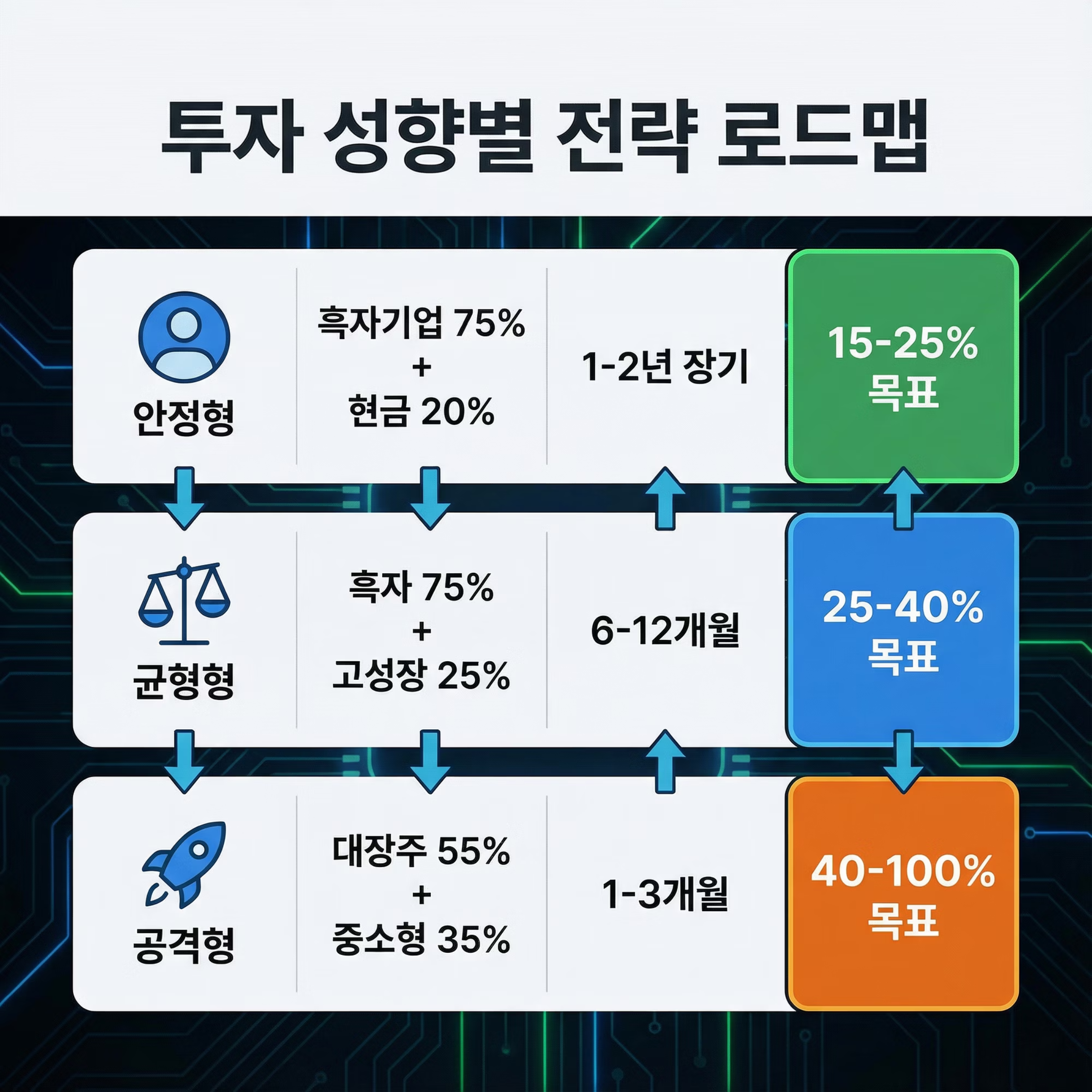 투자 전략은 자신의 성향에 맞춰야 해요. 안정형은 흑자 기업 중심으로 HL만도 포스코DX 로보티즈에, 균형형은 흑자 기업 75%에 고성장주 25% 배분, 공격형은 레인보우 두산 같은 대장주와 중소형 고성장주로 포트폴리오를 구성하는 게 현명해요.