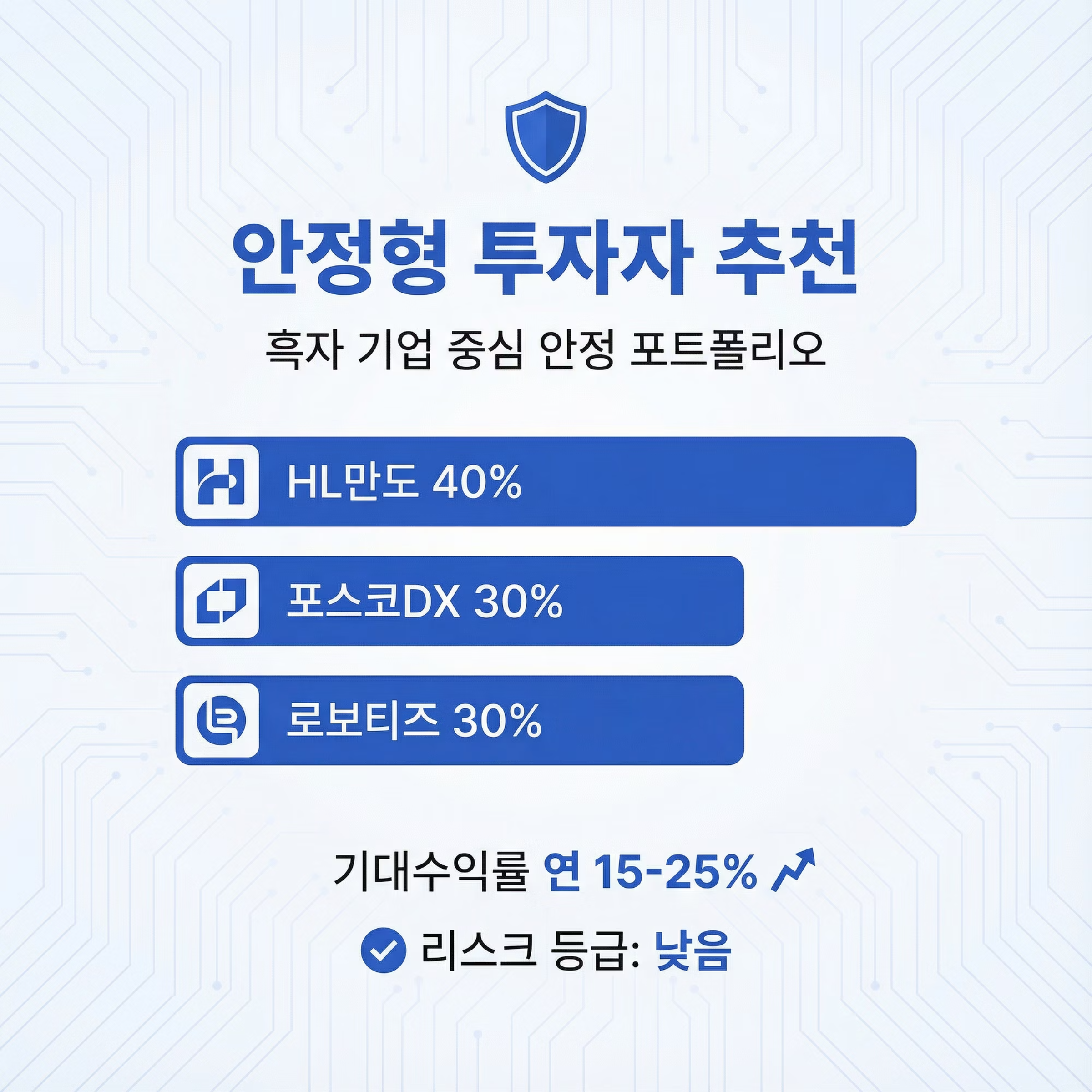 | 안정형 | HL만도 40% + 포스코DX 30% + 로보티즈 30% | 연 15~25% | 낮음 |