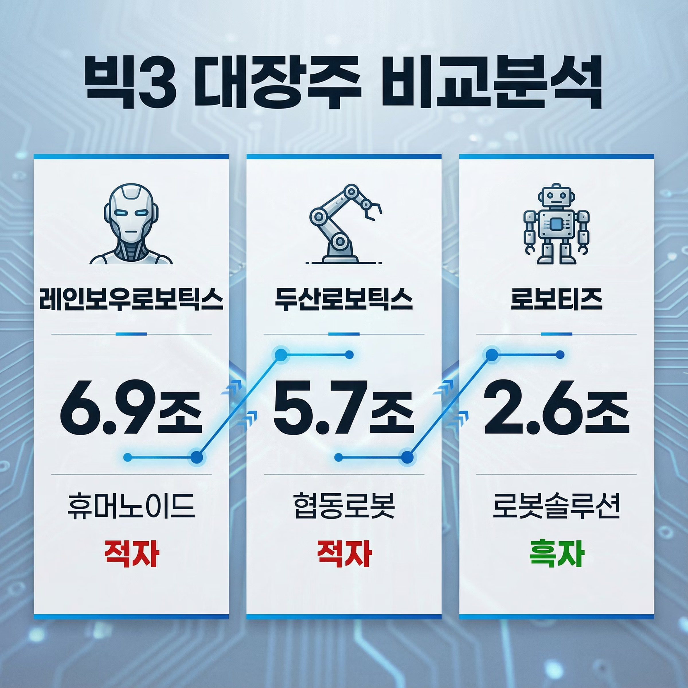 로봇주 시장을 대표하는 빅3는 레인보우로보틱스, 두산로보틱스, 로보티즈예요. 이 세 종목만 합쳐도 시가총액이 15조 원을 넘어가고, 개인투자자들의 관심도 압도적으로 높죠. 하지만 각 기업의 사업 모델과 재무 상태는 완전히 달라요.