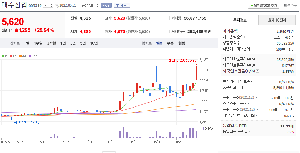 60년된 회사인많큼 오랜 노화우로 축적된 기술을 다수가지고 있다. 배합사료 시장의 대형화 와 집단화된 축산 농가들로인하여 사료회사들의 경쟁이 활발하게 이루어지고있고 이에 대응하기위해 고객밀착서비스와 프리미엄 제품으로 소비자 만족에 힘쓰고 있는 회사입니다. 오늘 상한가의 주요 요인 을 알아보자면 코로나19로인한 경기침체 와 러시아의 우크라이나 침공으로 인해 수출이 막혀 원자재의 가격이 급등중이다. 원자재뿐 이아니라 식량안보 등의 이유로 곡물가격 또한 계속 상승중인 가운데 수출을 금지한 국가들이 14개국에 달한다는 소식에 곡물관련주인 대주산업또한 상한가로 마감하였다. 5월16일에도 상한가 마감 했었는데 5일만에 두번째 상한가에 도달했다.