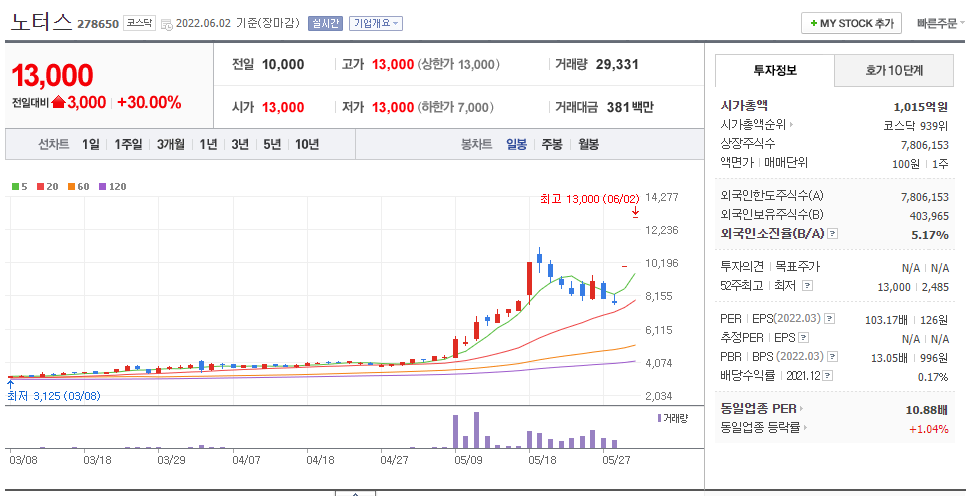 노터스는 신약 등 신규개발 후보 물질에 대한 비임상 실험을 진행하는 비임상 전문 임상수탁기관이다. 지난달 30일 노터스의 무상증자 권리락이 발생하면서 소유쥬식 1주당 신주8주를 배정한다는 대규모 무상증자 에 2틀연속 상한가로 마감했다.