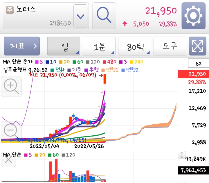 무상증자 관련하여 권리락의 효과를 톡톡히 보고 있다. 노터스는 6월 2일까지 보유한 주주들에게 한 주당 8주씩 배당한다고 밝혔었다 이에 권리락이 발생하면서 상승세의 모멘텀으로 인식하여 투자자들의 매수세가 늘어나며 사흘 연속 상한가로 직행했다.