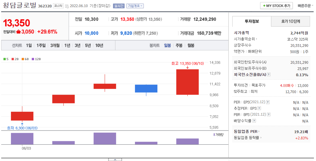 청담 글로벌은 생활용품 도매업 회사로. 글로벌 이커머스 플랫폼 인 알리바바, 징동 닷컴 등 견고한 파트너십을 유지하면서 최근 3년간 연매출 123% 증가하면서 고속성장을 진행 중인 회사다. 진둥닷컴 의 창립기념일 행사소식에 7일 상한가로 마감했던 청담 글로벌은 진둥닷컴 의 창립기념 길 행사 기대감과 최근 중국의 도시 봉쇄 해제 소식까지 이어지면서 상한가로 마감했다 증권 리포트에서 제시했던 투자목표는 13000 원으로 제시했었다.