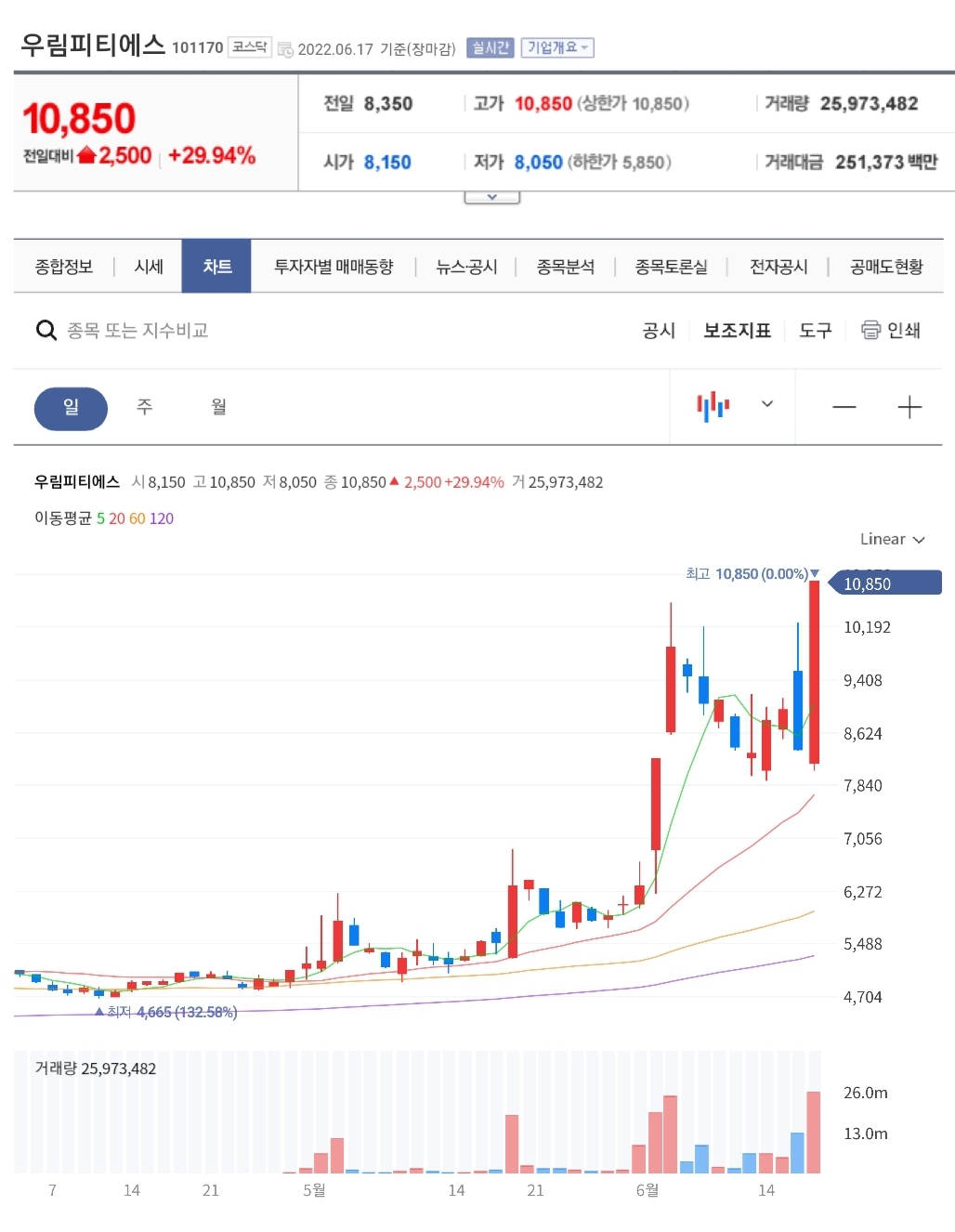 우림 피티에스는 철강, 조선, 산업, 중장비, 해양플랜트 분야에서 감속기 사업을 영위하는 기업이며 삼성중공업 등 다른 업체들과 감속기 개발, 공급에 협력하고 있는 회사이다. 현 정부에서 국책과제로 로봇 정밀 감속기의 국산화 개발에 우림 피티에스가 나선다는 소식과 삼성전자가 세계 최대 전자, 정보기술 전시회인 CES2022에서 반도체, 모바일, 가전 등 전 사업 부분의 M&A 가능성을 밝히며 그중에 로봇 반도체와 삼성중공업 사이에 협력이 본격화될 것이란 전망에 우림 피티에스는 6월 3일 상한가 에이어 오늘 17일은 테슬라가 부품 수급 문제를 이유