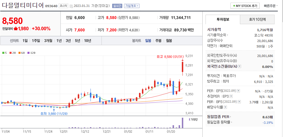 다믈멀티미디어는 멀티 미디어 반도체 제조및 판매등을 주사업으로 하며, 반도체 설계 파운드리를 전문으로 삼성전자와 후지쯔를 거래사로 두고있다. 오늘 상한가는 최대주주변경과함께 주식 양수도 계약이 체결됬다는소식에 상한가로 마무리되었다. 기존의 최대주주인 베노 홀딩스외 1명이 보유중인 300만주를 고스트 로보틱스 테크놀러지에 300원에 매도 하는 계약을 체결하며 고스트 로보틱스 테크놀로지의 지분비율이 29.36% 로 늘어나면서 최대주주로 변경된다. 최대주주의 변경일자는 3월 22일임.
