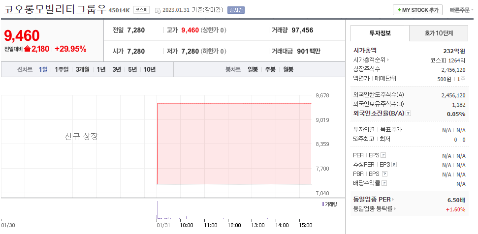 코오롱 글로벌 에서 자동차 사업부분이 인적 분할되면서 신설된 법인으로 신규상장했다. 신규상장 관련으로 재상장 첫날 상한가 마감했다. 코오롱모빌리티 그룹은 SUV, EA 영역에서 신규 브랜드 를 확보및 멀티 브랜드로 구축 에 나선다고 한다. 또한 프리미엄 구독 서비스, 중고차사업 등의 모빌리티 밸류체인을 확대할 밝혔다. 첫번째 순보로는 스웨덴의 순수전기 바이크 브랜드 'CAKE' 의 국내 단독 수입사로서 공식 유통을 진행한다고 밝혔다.