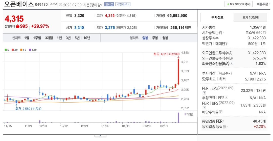 딥노이드 와 오픈베이스 상한가이유는 중국 알리바바에서 쳇 GPT와 같은 인공지능 대화형 챗봇 개발에 착수했으며 했다는 소식에 알리바바 관련주로 상한가로 마무리했다
