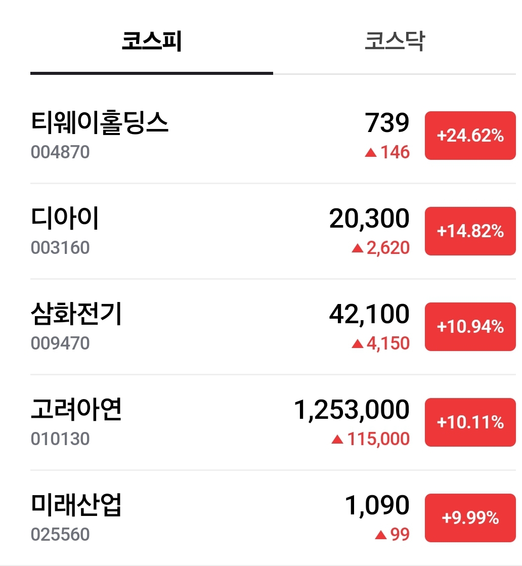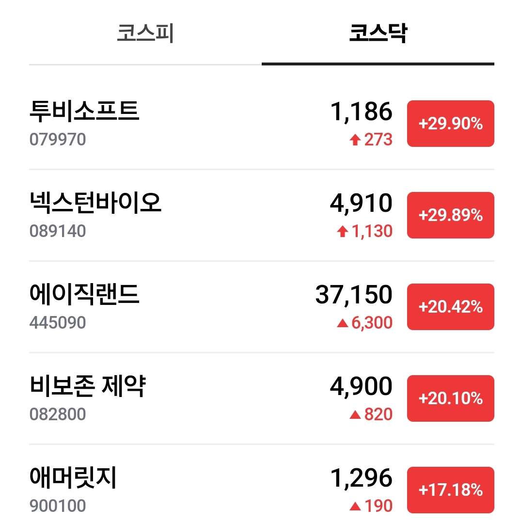 코스피 코스닥 상승 5위까지 입니다