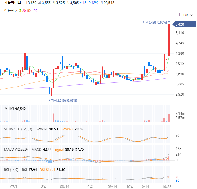 피플바이오는 주가가 최근 이동평균선을 모두 상회하며 강한 상승세를 보이고 있는 바이오 기술 기업중 한곳입니다. 주로 바이오 헬스케어와 기술 기반의 진단 솔루션을 제공하며, 헬스케어 산업에서의 성장 가능성이 주목받고 있습니다.피플바이오의 알츠온 플러스는 기존의 고가 진단법(예: PET 스캔, 뇌척수액 검사) 대비 낮은 비용으로 알츠하이머를 조기 진단할 수 있는 기술을 보유하고 있으며, 이러한 진단 방식이 글로벌 시장에서 주목받고 있습니다. 특히, 기존의 복잡하고 비용이 많이 드는 방법 대신 혈액으로 진단이 가능하다는 점이 투자자들에게 긍정적으로 작용했습니다.