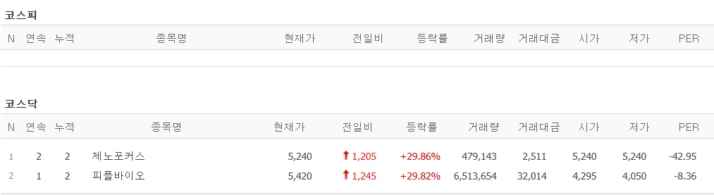오늘 상한가 종목 은 제노포커스와 피플바이오