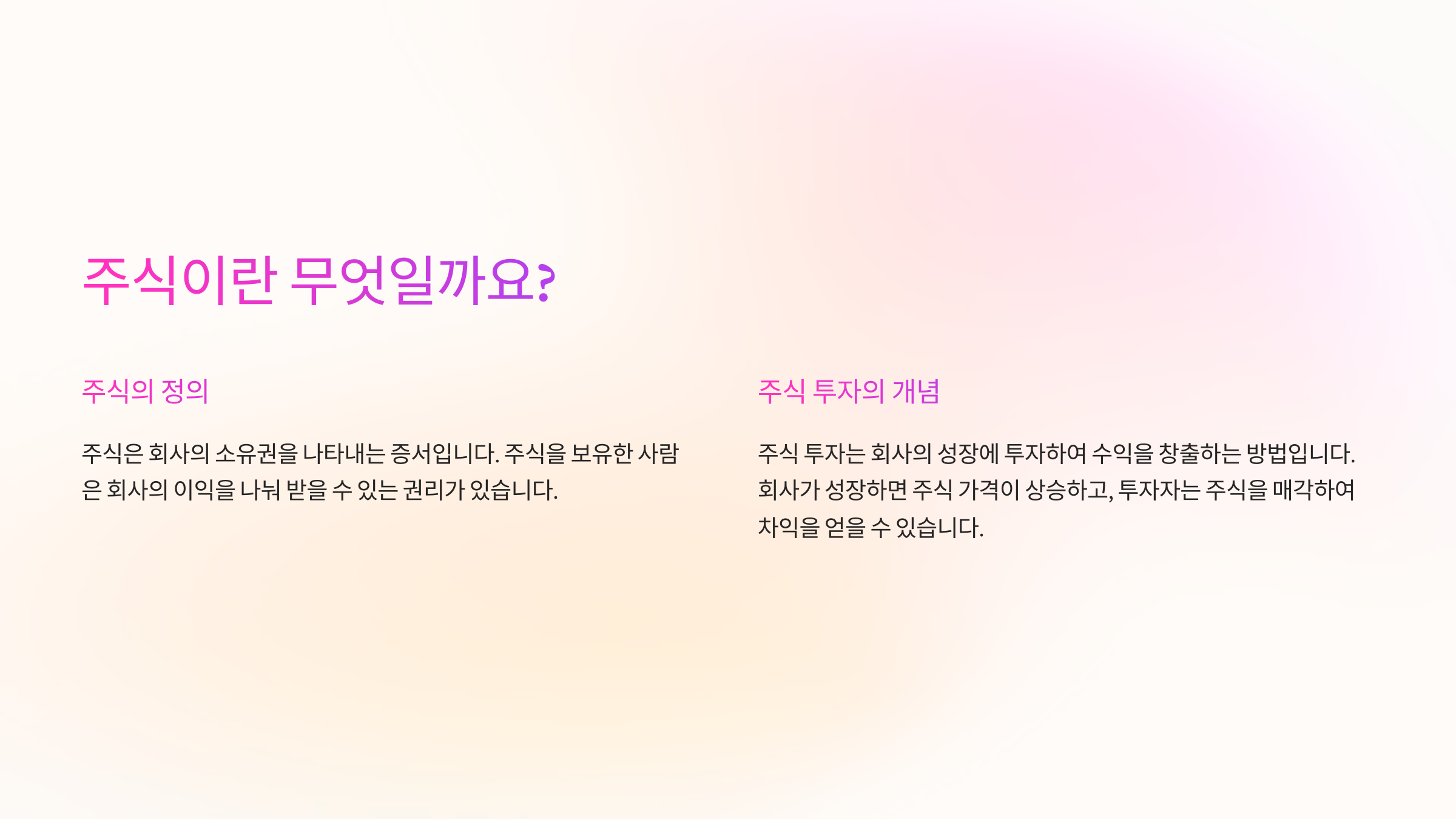 주식은 기업이 자금을 조달하기 위해 발행하는 증서예요. 투자자들은 주식을 구매함으로써 해당 기업의 지분을 소유하게 되고, 기업의 성장과 함께 이익을 얻을 수 있어요. 즉, 주식을 보유하면 회사의 주인이 되는 거예요.