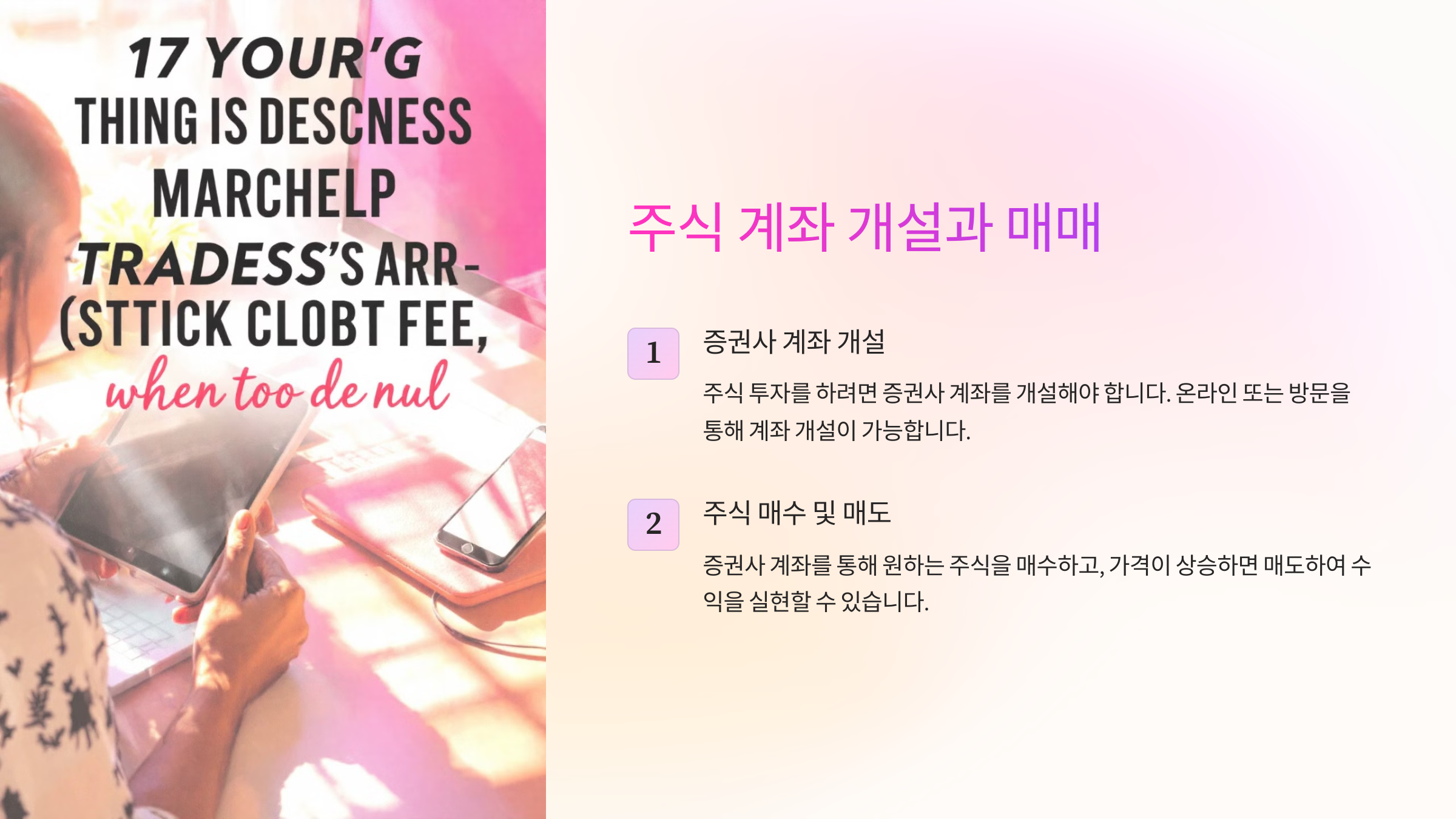주식 투자를 시작하려면 먼저 주식 계좌 를 개설해야 해요. 은행 계좌를 여는 것과 비슷하지만, 주식 계좌는 증권사를 통해 만들어야 해요. 계좌 개설 후에는 원하는 종목을 선택해 매수하고, 적절한 시점에 매도하여 수익을 얻는 방식으로 투자해요.