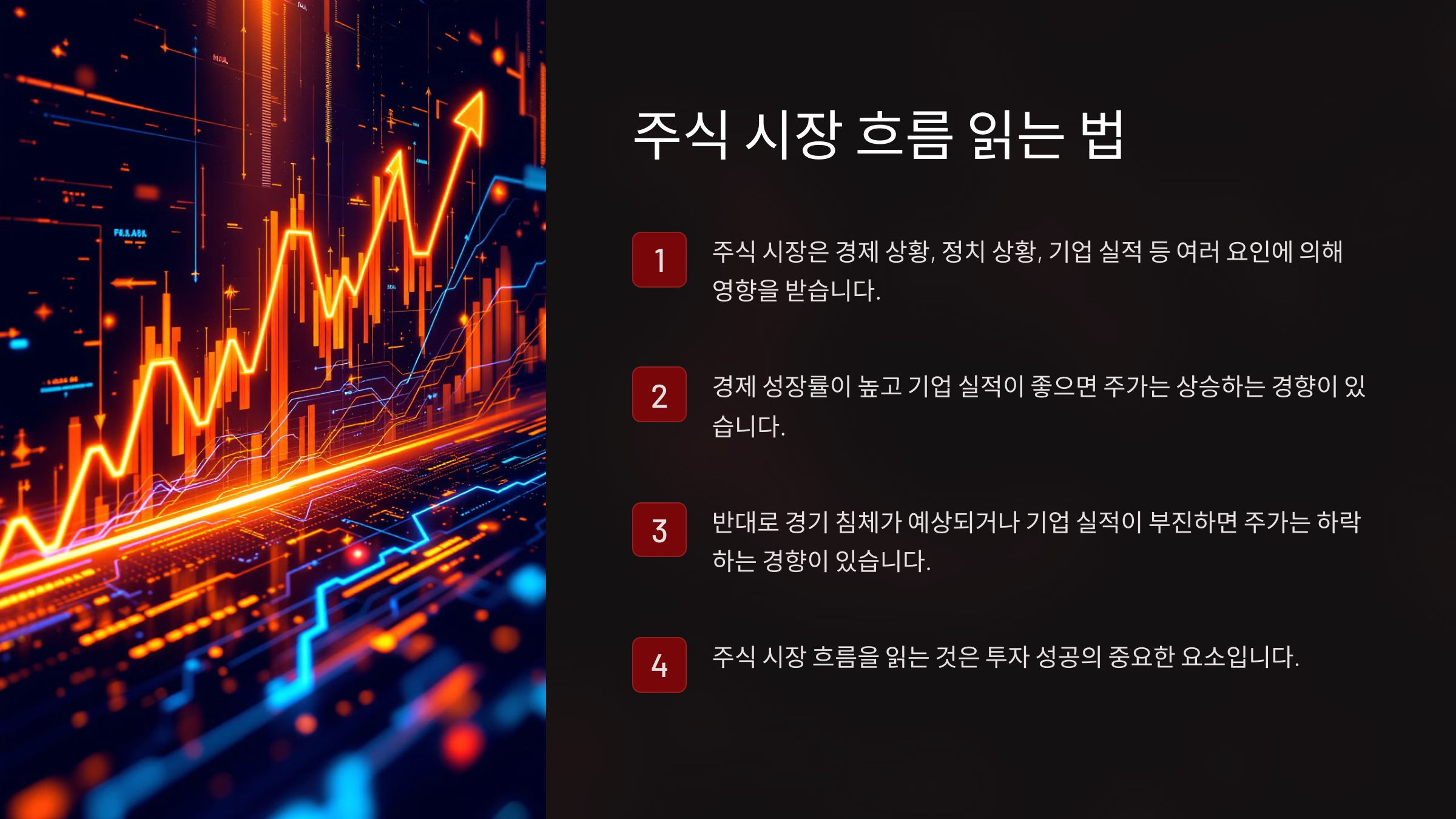 ✅ 요약: 주식 시장 흐름을 읽으려면 경제 지표, 차트 분석, 투자자 동향을 파악해야 해요. 시장이 상승할 때와 하락할 때의 특징을 이해하면 더 나은 투자 결정을 할 수 있어요!