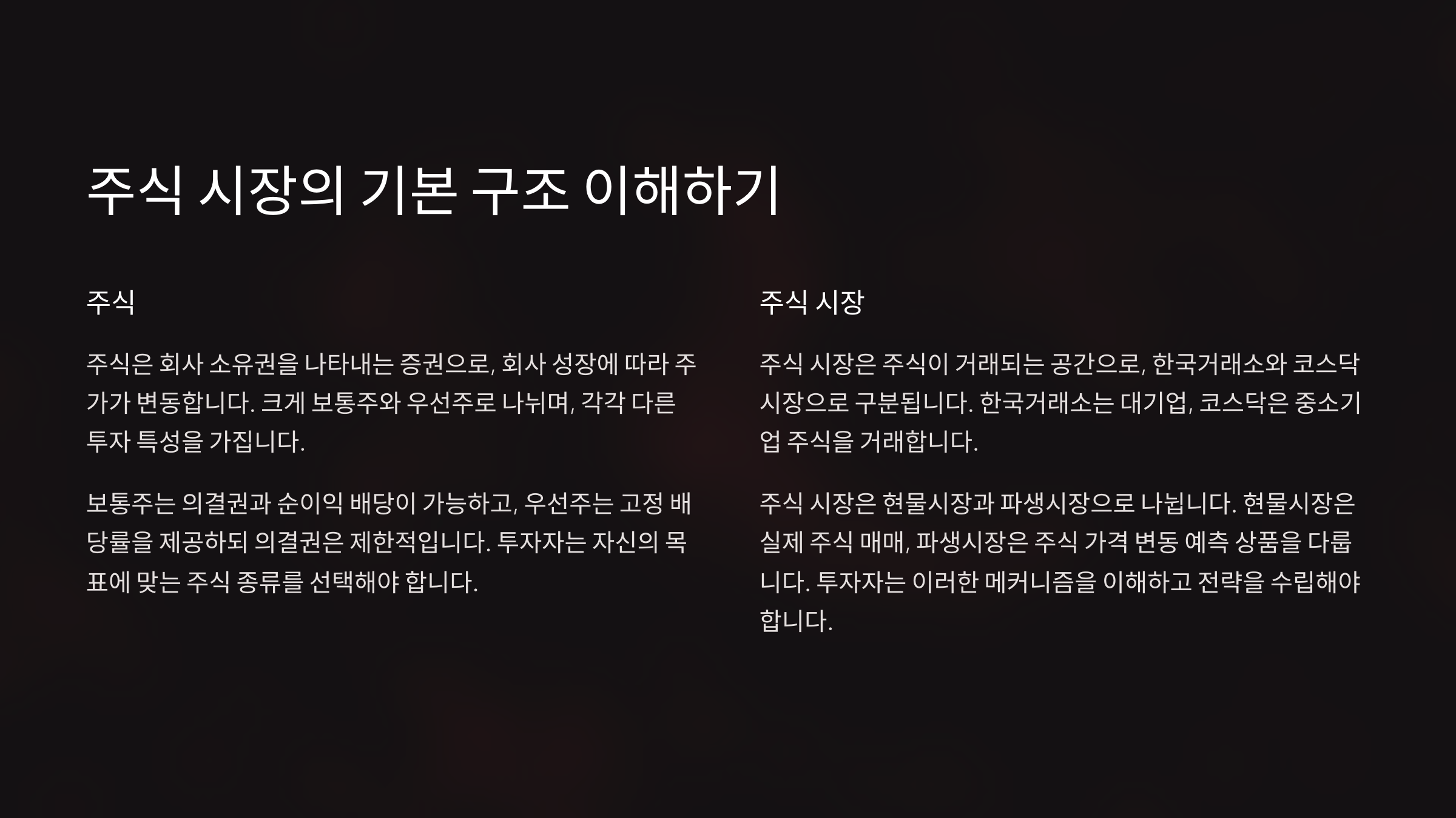 주식 시장은 많은 사람들이 부를 쌓기 위해 뛰어드는 곳이지만, 제대로 이해하지 못하면 큰 손실을 볼 수도 있어요. 성공적인 투자를 위해서는 시장 구조, 흐름을 읽는 법, 경제 지표 해석, 투자 전략 등을 알아야 해요.
