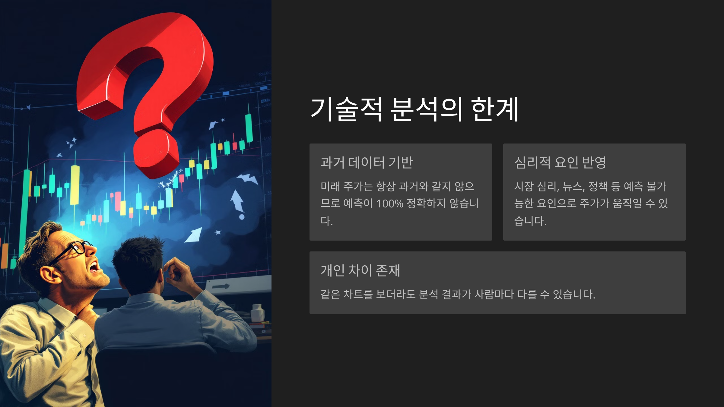 | 주관적인 해석 | 같은 차트를 보고도 투자자마다 해석이 다를 수 있음 |