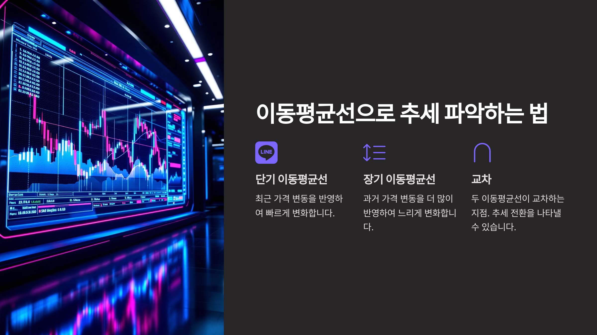 요약: 이동평균선은 추세 분석매매 타이밍을 잡는 데 유용해요. 특히 골든크로스는 매수 신호, 데드크로스는 매도 신호로 활용할 수 있어요!