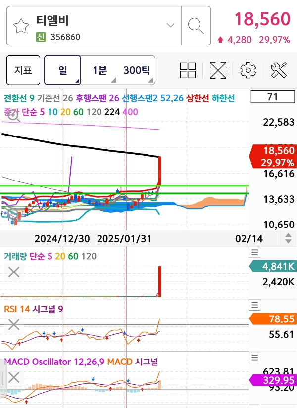 📡 티엘비 (주가: 18,560원, +29.97%)