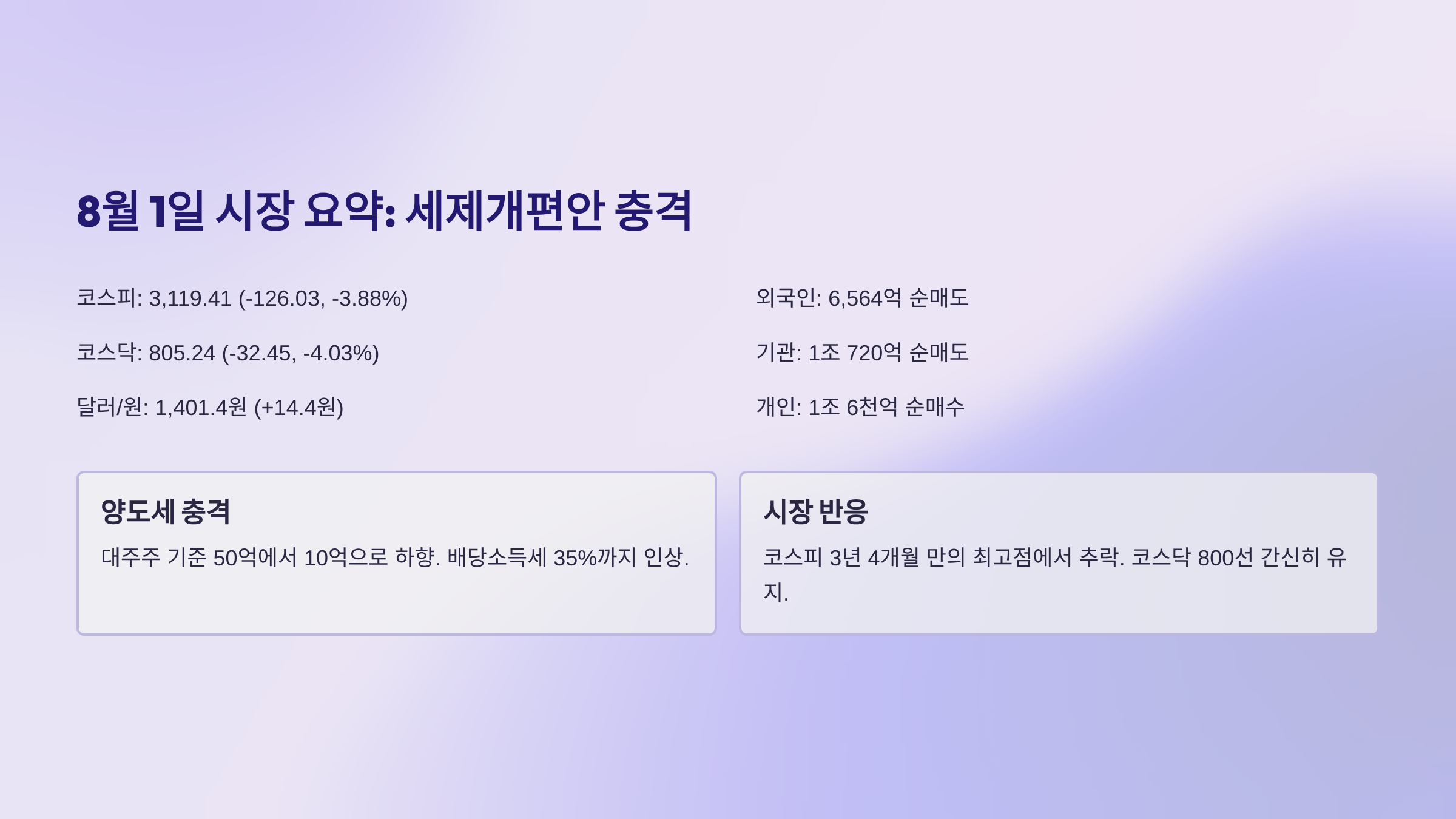 세제개편안은 단기간에 해결될 문제가 아니다. 양도세 기준 낮추고 배당세 올리는 건 이미 확정된 방향이거든. 당분간 시장이 무거울 수밖에 없다.