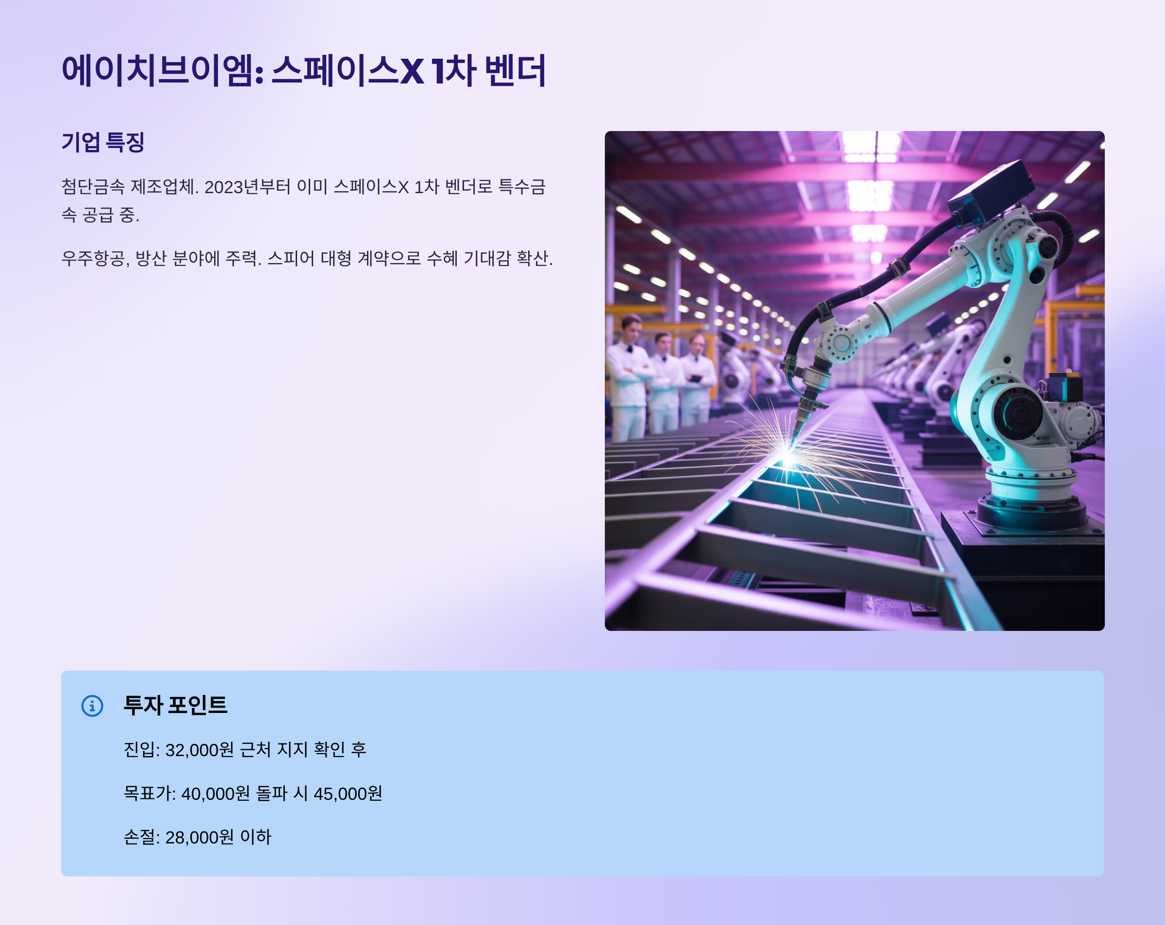 에이치브이엠은 스피어와 다르다. 이미 2023년부터 스페이스X에 특수금속을 공급하는 1차 벤더였거든. 그러니까 "우리도 스페이스X랑 일해요" 하면서 따라 오른 거다.