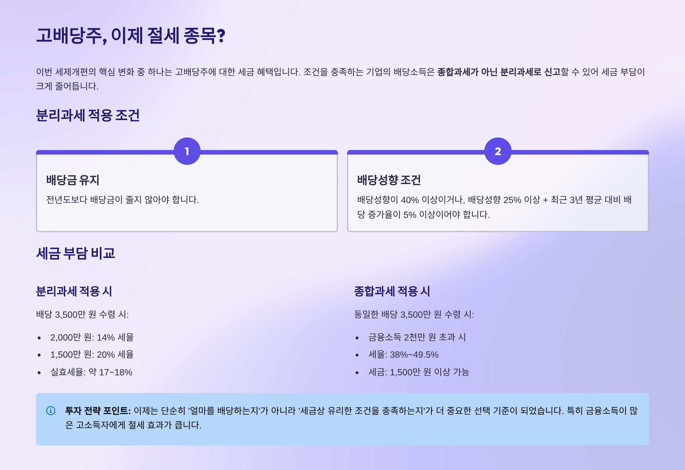 배당소득은 원래 금융소득에 합산돼 종합과세 대상이 되는데, 여기엔 최대 49.5%까지 세금이 붙을 수 있습니다. 그런데 이번 개편으로, 조건을 만족하는 고배당주는 이 부담을 확 낮출 수 있어요.