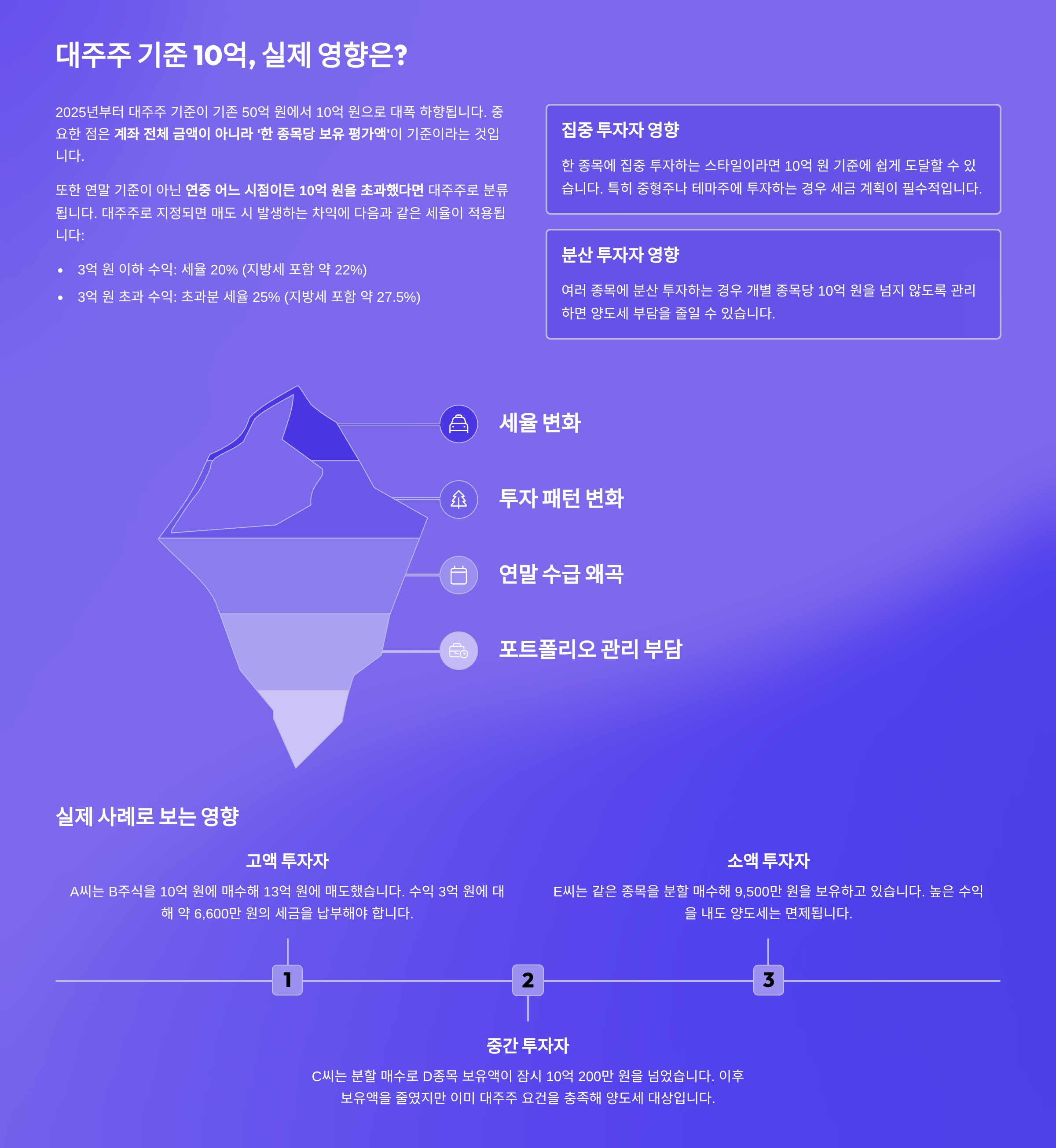 2025년부터 바뀌는 대주주 양도세 기준은 그야말로 '게임의 룰'을 바꾸는 요소입니다. 예전엔 대부분 투자자들이 해당되지 않았던 50억 기준이었지만, 이제는 10억만 넘으면 과세 대상이 되기 때문이죠.