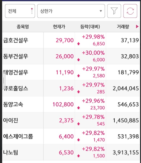 | 금호건설우 | 29,700 | +29.98% |