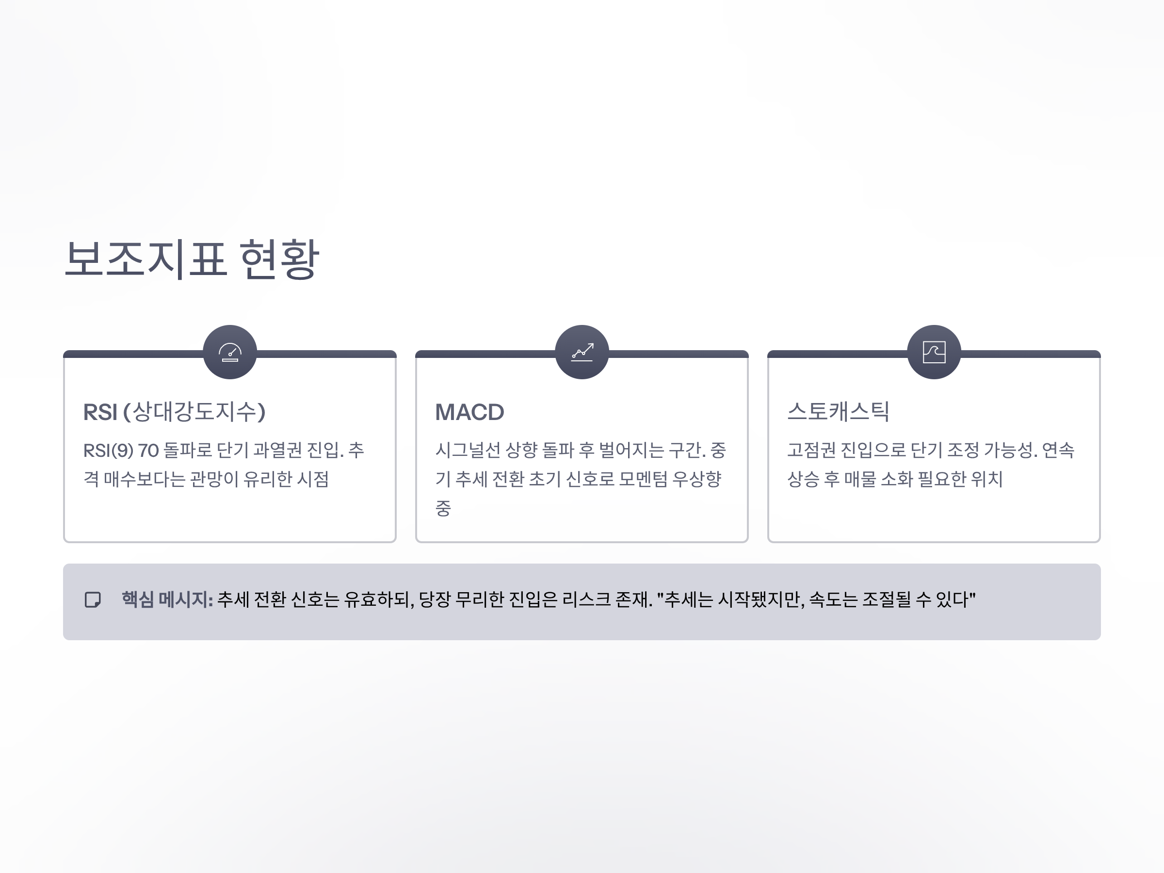 정리하자면, 보조지표들은 모두 추세 전환 신호는 유효하되, 당장 무리한 진입은 리스크가 있다는 경고도 함께 담고 있다. 쉽게 말해, “추세는 시작됐지만, 속도는 조절될 수 있다”는 뜻이다.