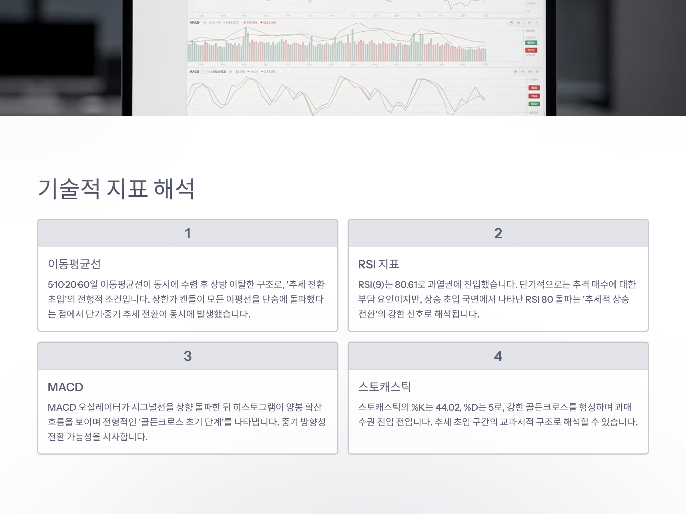 스토캐스틱의 %K는 44.02, %D는 5로, 강한 골든크로스를 형성하며 과매수권 진입 전이다. 이 신호는 추세 초입 구간의 교과서적 구조로 해석할 수 있다.