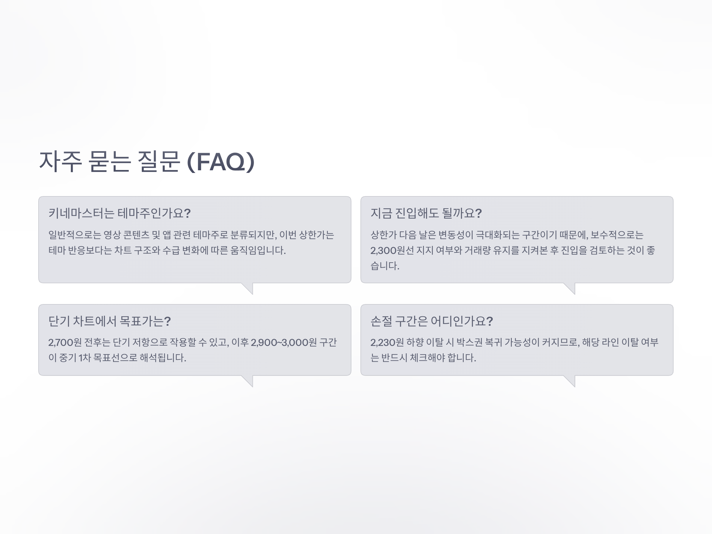 2025년 12월 30일 키네마스터는 전일 대비 +30% 상한가(2,600원)를 기록했다. 하지만 주가 급등 당일에는 별도의 공시나 뉴스가 존재하지 않았다. 이 점에서 단기 재료에 의한 급등이 아니라 가격 구조와 수급 전환의 결과로 해석할 수 있다.