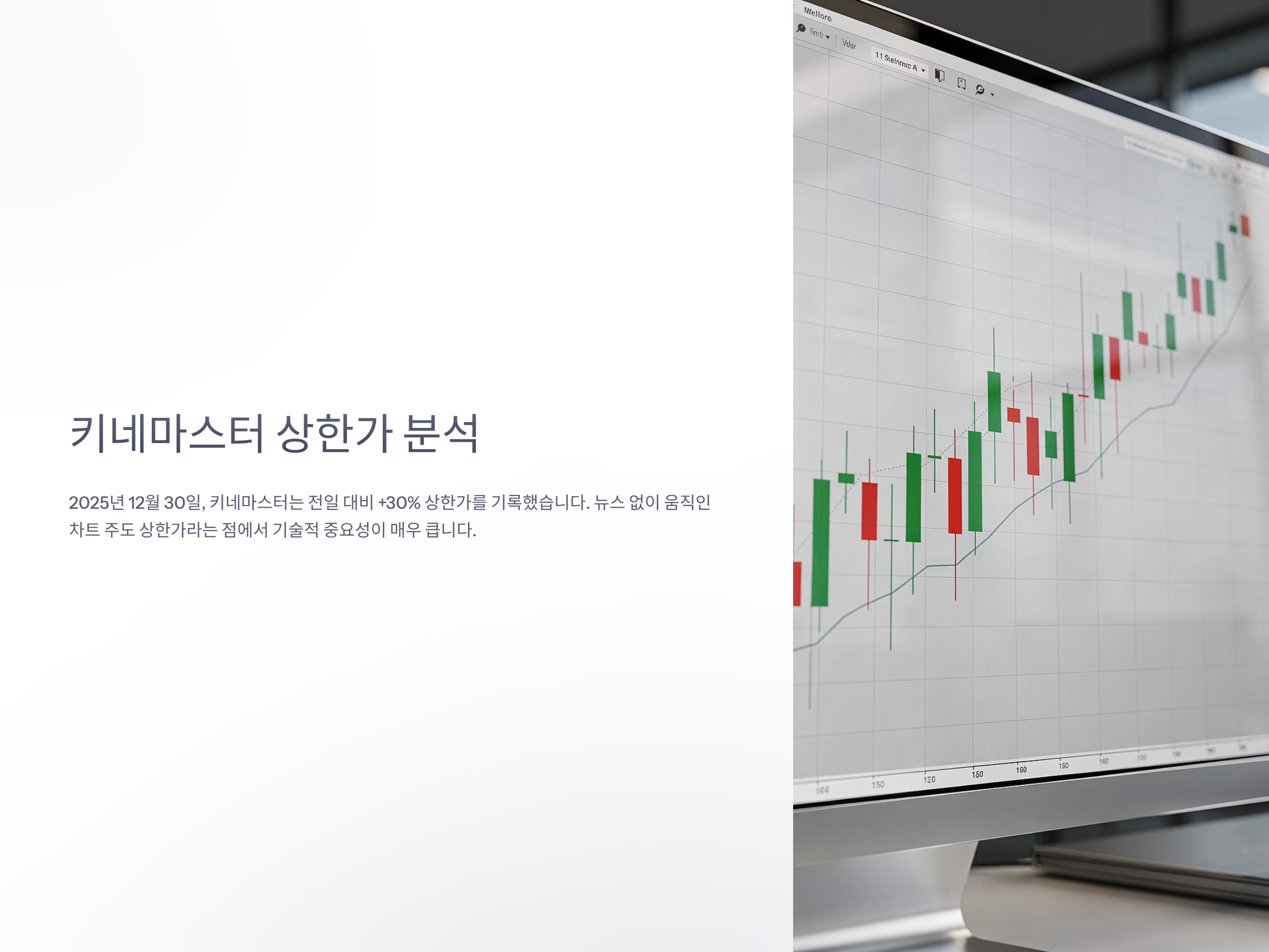 2025년 12월 30일, 키네마스터가 상한가(30%)를 기록하며 시장의 주목을 받았다. 흔히 ‘영상·앱 관련 테마주’로 분류되지만, 이번 급등은 단순한 뉴스 반응이라 보기 어렵다. 실차트와 기술적 흐름, 그리고 수급 구조를 살펴보면 이 상한가는 구조적 전환의 시작점일 수 있다.