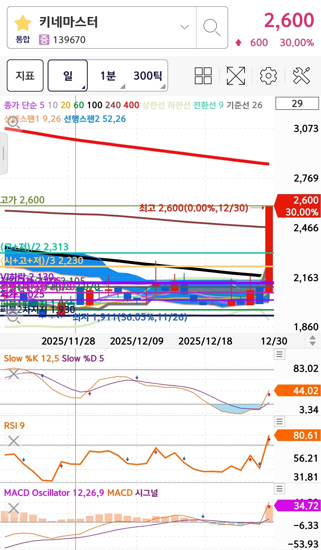 2025년 12월 30일 키네마스터는 전일 대비 +30% 상한가(2,600원)를 기록했다. 하지만 주가 급등 당일에는 별도의 공시나 뉴스가 존재하지 않았다. 이 점에서 단기 재료에 의한 급등이 아니라 가격 구조와 수급 전환의 결과로 해석할 수 있다.