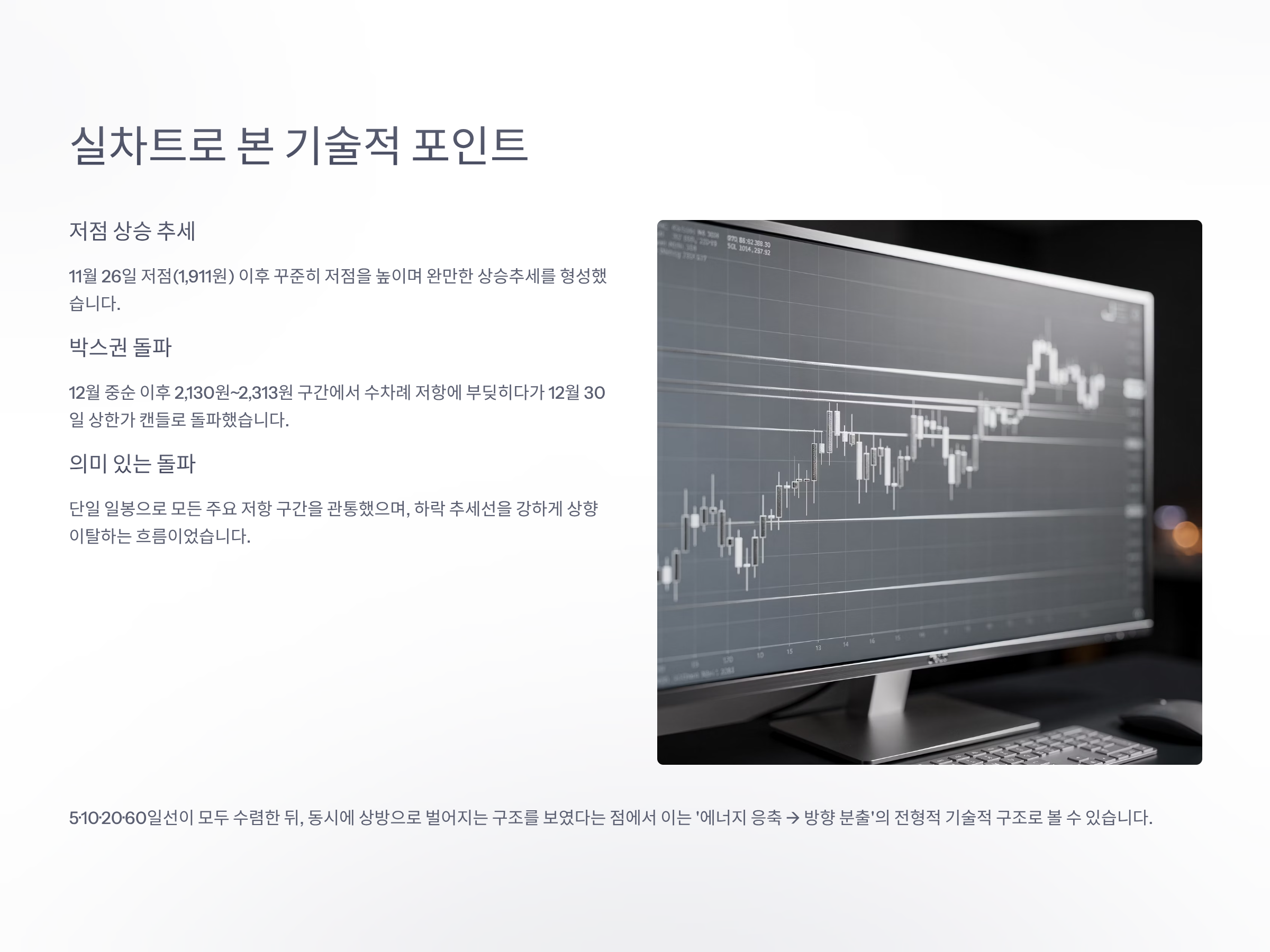주가 흐름을 보면, 11월 저점 1,911원 이후 오랜 기간 박스권(2,100~2,300원)을 형성하며 시장 관심에서 멀어져 있었으나, 연말 들어 일부 매수세가 집중되며 차트상 수렴이 극대화된 구간에서 상한가 돌파가 나타났다.