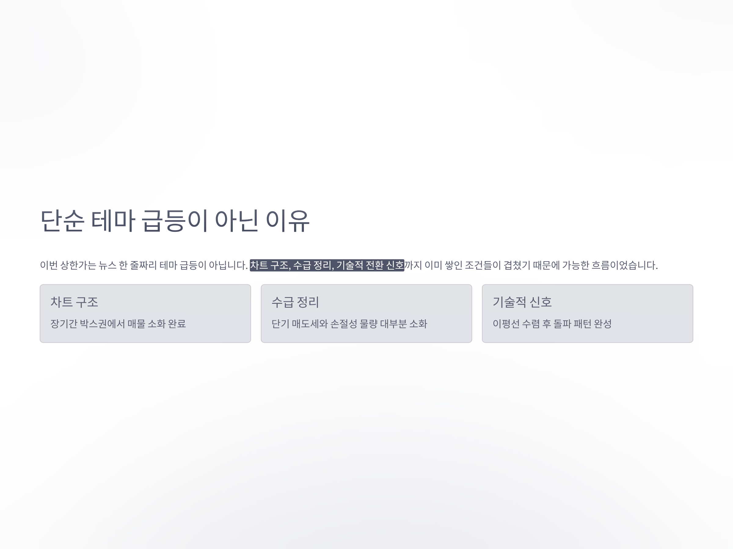 중요한 건, 이게 단순히 뉴스 한 줄짜리 테마 급등이 아니라는 점입니다. 차트 구조, 수급 정리, 기술적 전환 신호까지 이미 쌓인 조건들이 겹쳤기 때문에 가능한 흐름이었습니다.