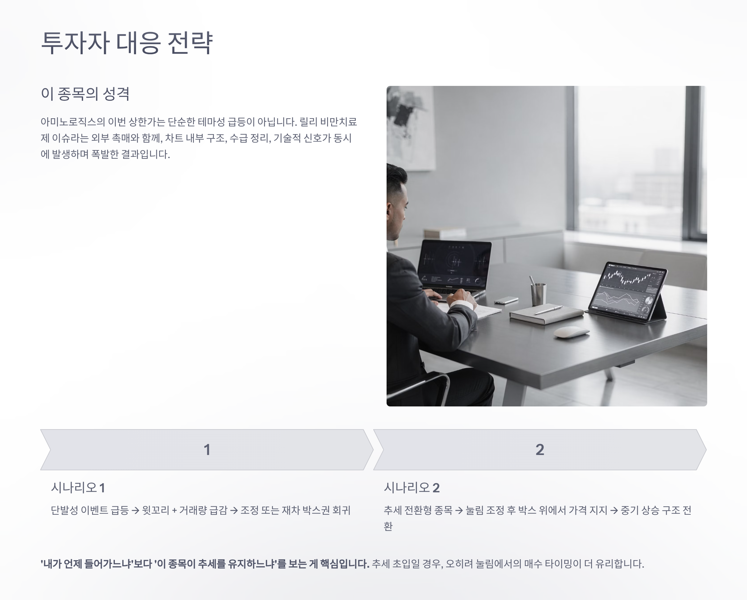 아미노로직스의 이번 상한가는 단순한 테마성 급등이 아닙니다. 릴리 비만치료제 이슈라는 외부 촉매와 함께, 차트 내부 구조, 수급 정리, 기술적 신호가 동시에 발생하며 폭발한 결과입니다.