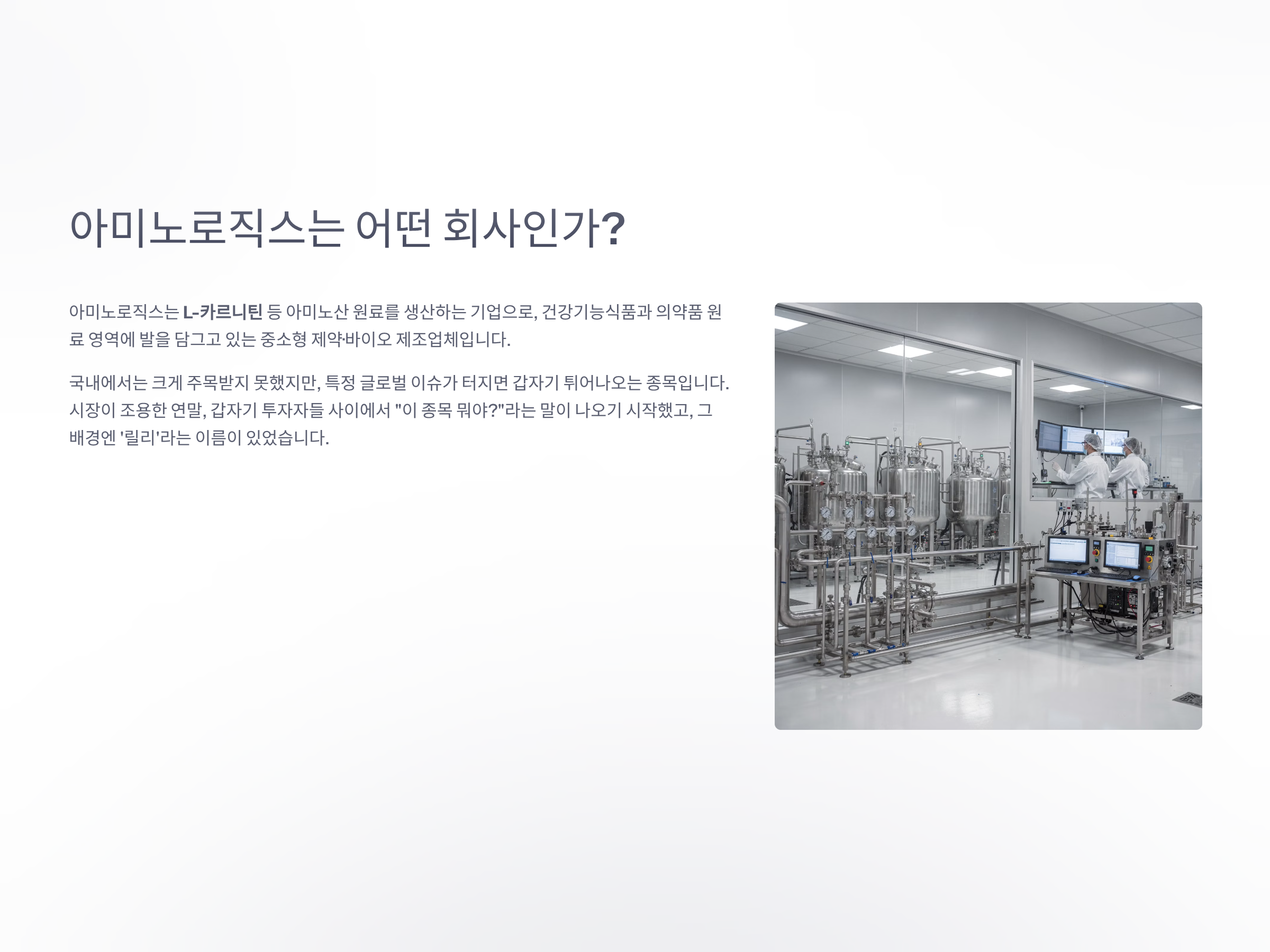 아미노로직스는 L-카르니틴 등 아미노산 원료를 생산하는 기업으로, 건강기능식품과 의약품 원료 영역에 발을 담그고 있는 중소형 제약·바이오 제조업체입니다. 국내에서는 크게 주목받지 못했지만, 특정 글로벌 이슈가 터지면 갑자기 튀어나오는 종목이기도 합니다.