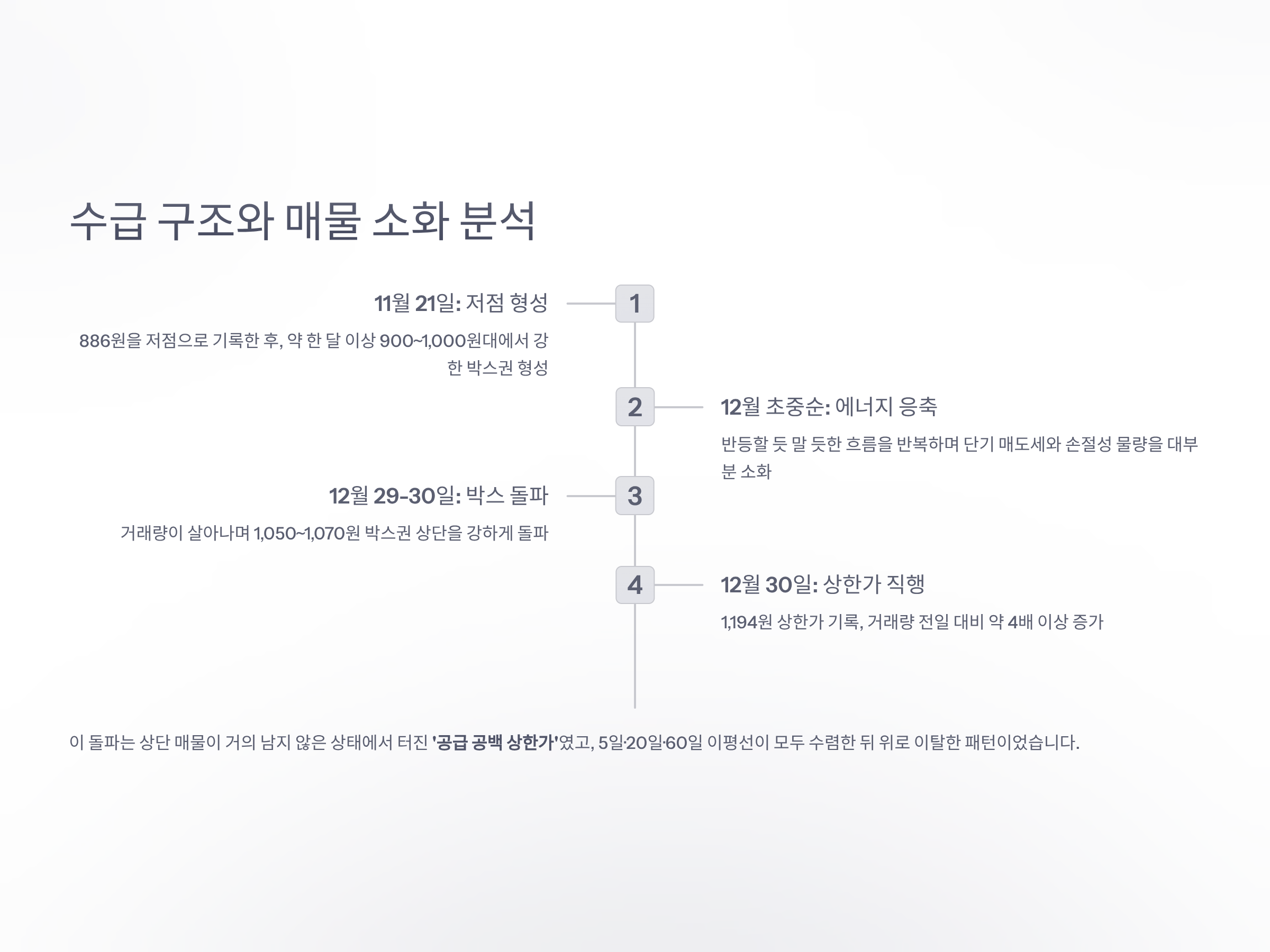 12월 29~30일, 거래량이 슬슬 살아나는 와중에 기존 박스권 상단인 1,050~1,070원 구간을 강하게 돌파했고, 12월 30일 장중 급등으로 1,194원 상한가 직행이 연출됐습니다.