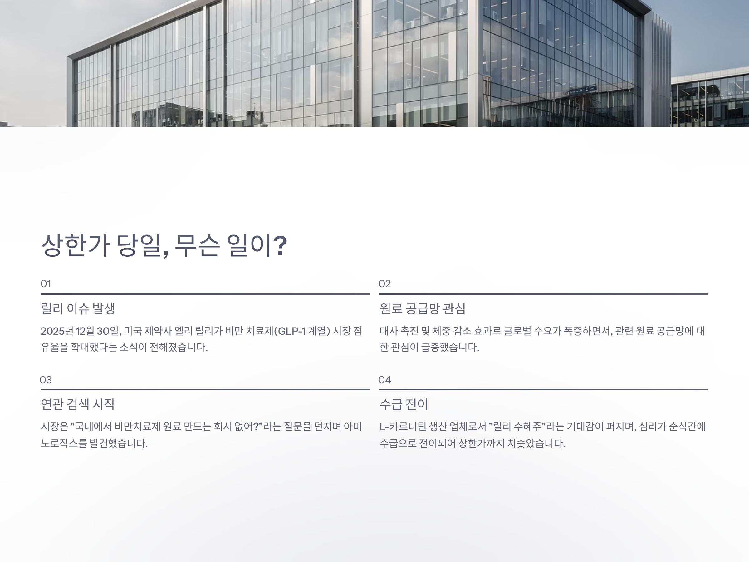 여기서 연결된 게 바로 아미노로직스입니다. 이 회사는 L-카르니틴을 생산하는 몇 안 되는 업체 중 하나로, 이는 지방산의 산화에 관여하는 체지방 연소 보조물질로 알려져 있습니다. 투자자들 사이에서 “릴리 수혜주 아니냐?”는 기대감이 퍼졌고, 그 심리는 순식간에 수급으로 전이되며 상한가까지 치솟은 것입니다.