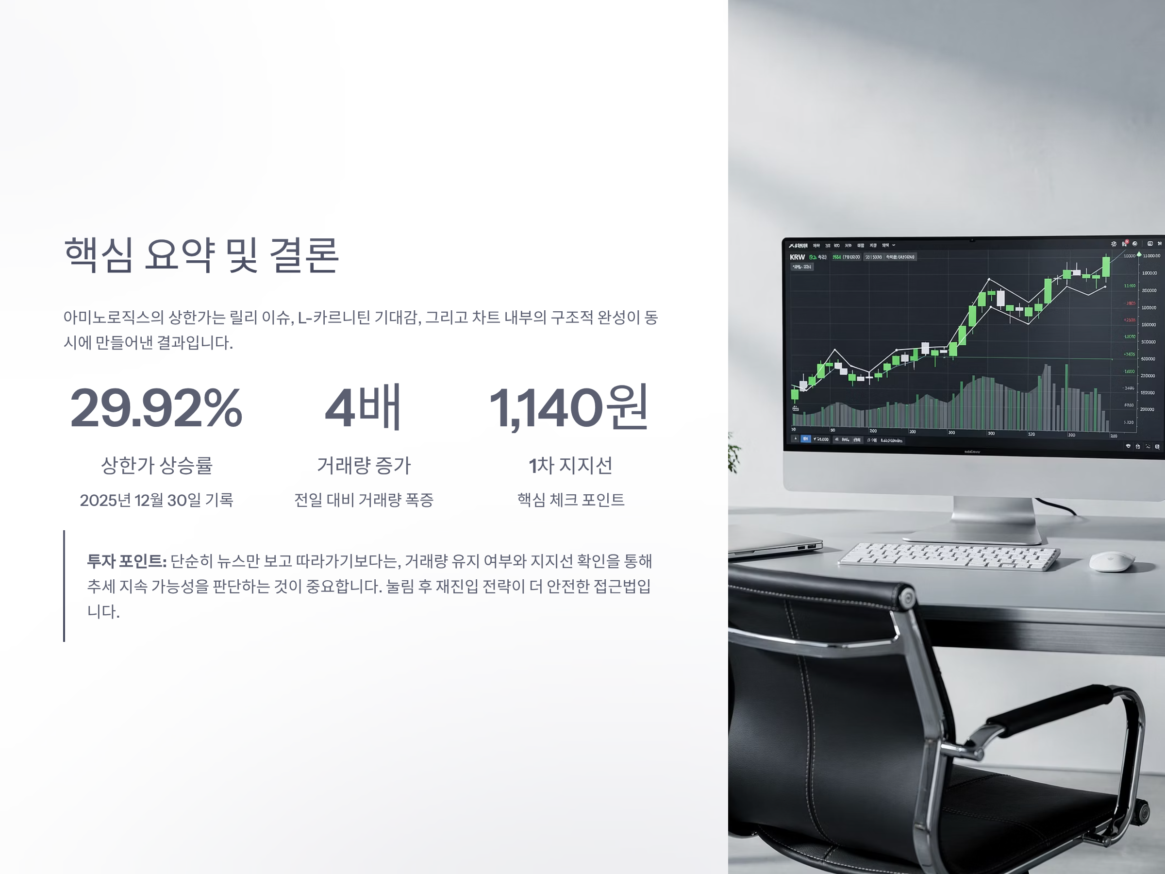 2025년 연말, 증시가 조용할 줄 알았는데 뜬금없이 뉴스 피드에 등장한 종목이 있습니다. ‘아미노로직스’. 생소했던 이 기업이 단숨에 29.92% 상한가를 기록하면서, 많은 투자자들이 깜짝 놀랐죠.