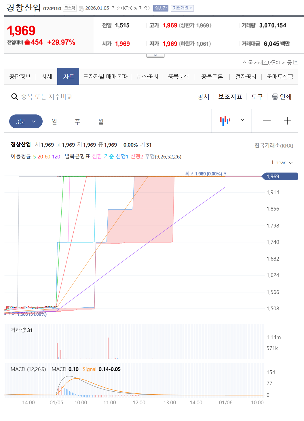 차트가 숨을 헐떡일 새도 없이 상한가 문을 걸어 잠가버린 주인공, 바로 경창산업(024910) 이야기입니다.