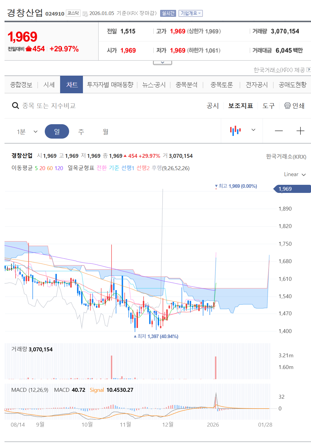 거래량 3,070,154주. 최근 일평균 거래량의 수십 배입니다. 이건 그냥 '관심 좀 있다' 수준이 아니라, "뭔가 큰일 났다"는 시장의 외침입니다. 세력이 들어왔거나, 큰 재료가 터진 거죠.