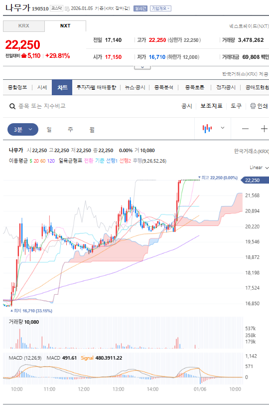 그러다 12월부터 서서히 고개를 들기 시작합니다. 14,000원 박스권을 벗어나고, 18,000원을 돌파하고, 20,000원 저항선을 뚫습니다. 그리고 2026년 1월 5일, 22,250원 상한가로 폭발합니다.