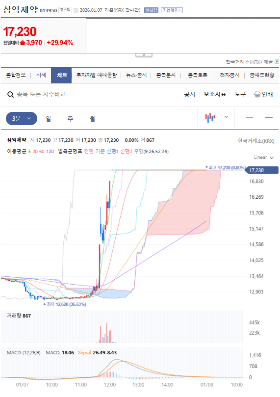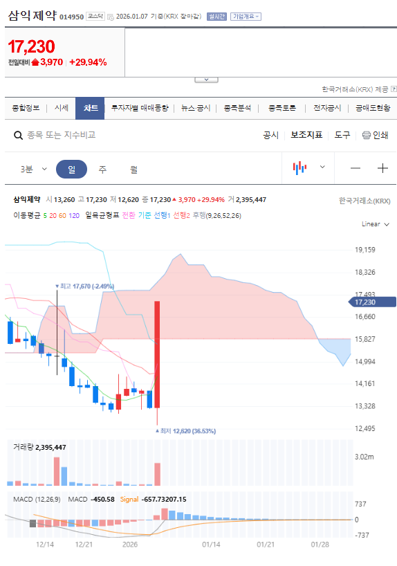 - 한마디: 삼익제약은 '오래된 제약사'에서 '바이오 기술 기업'으로 체질 개선 중입니다. 오늘의 상한가는 그 변화를 알리는 신호탄입니다. 단기 시세보다는 기업의 체질 변화에 주목할 시점입니다.