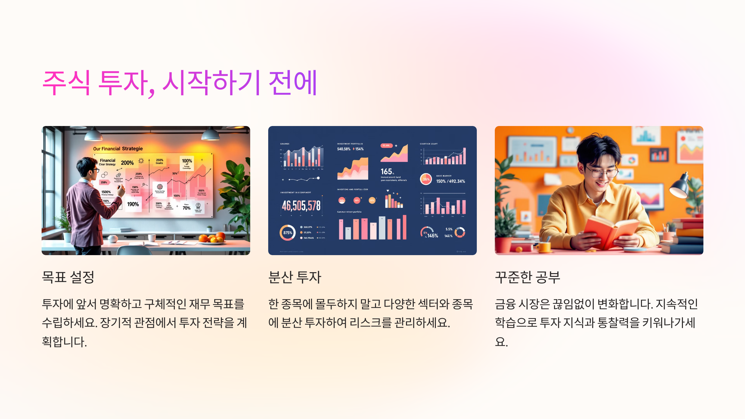 주식 투자는 단순히 ‘운’이 아니라 공부하고 경험을 쌓아야 안정적인 수익을 낼 수 있어요. 이번 글을 통해 기초 개념을 확실히 익히고, 실전 투자에 한 걸음 더 다가가 보세요!